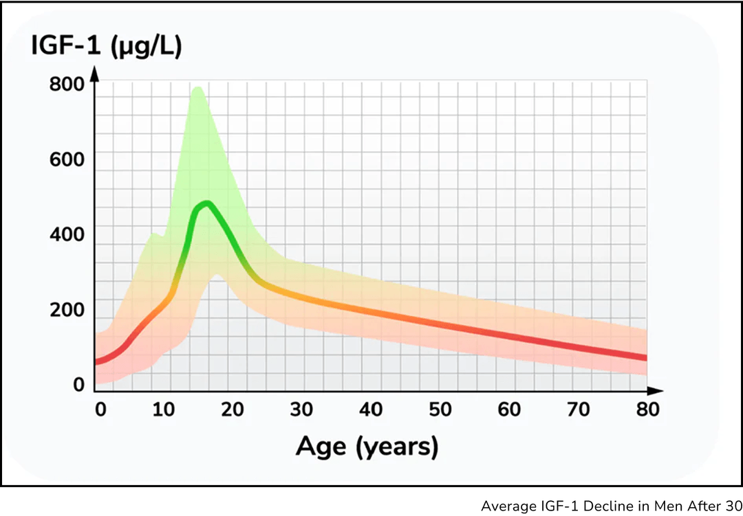 It’s Not Just Testosterone — It’s Growth Factor Decline.By your mid-30s, testosterone naturally decreases — but that’s only part of the picture. Growth factors (like IGF-1) also shift, and they play a key role in muscle, fat loss, recovery, and energy*